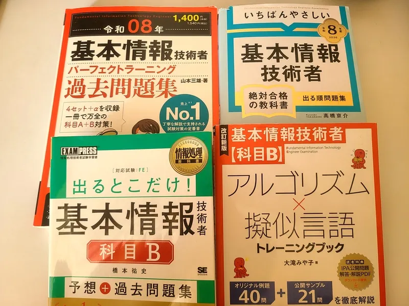 今回は4冊買って勉強をしていきましたが、科目Aの『いちばんやさしい基本情報技術者試験』と科目Bの『アルゴリズム×疑似言語トレーニングブック(通称:大滝本)』、『出るとこだけ!基本情報技術者科目B』の3冊で十分だなと感じました。