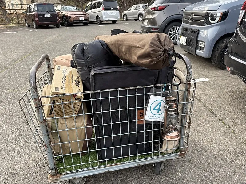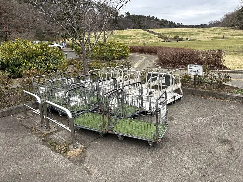 駐車場の一画には運搬に使用できる台車がありました。