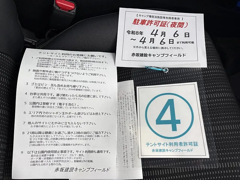 駐車許可証は車に、番号のプラカードはテントに掲示しましょう。