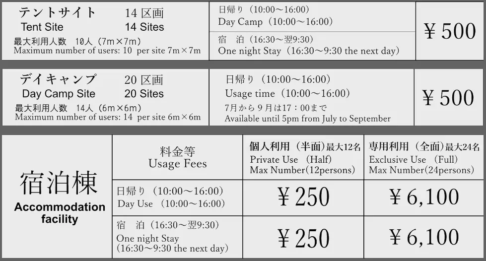 デイキャンプサイトは日帰りのみ、テントサイトは日帰りと宿泊ができるサイトです。