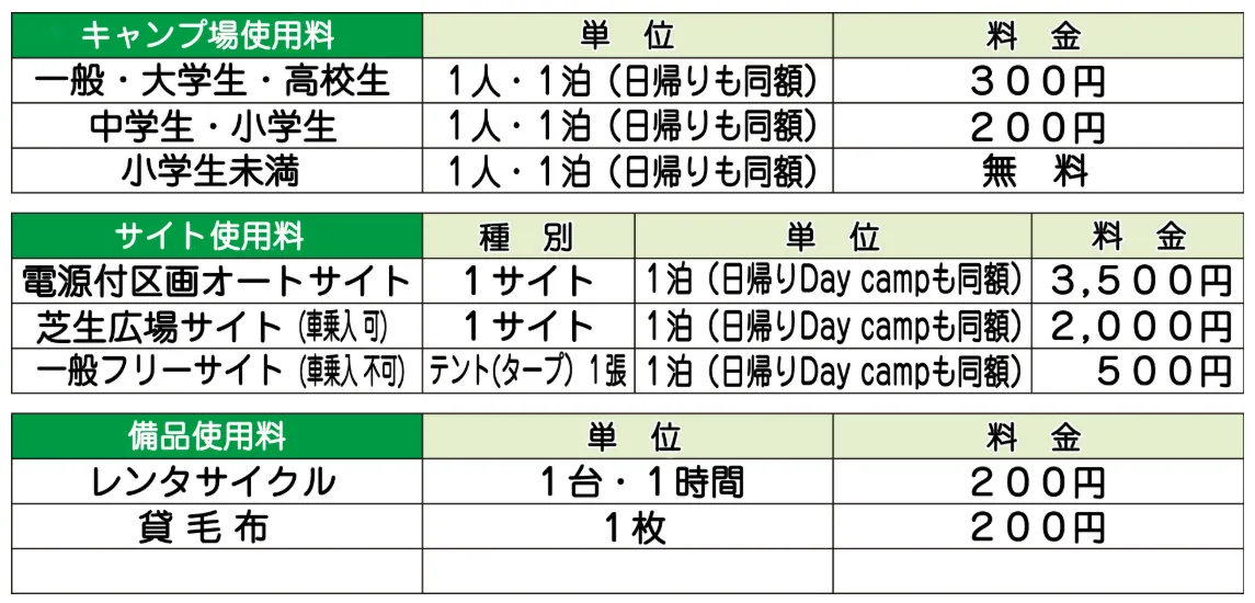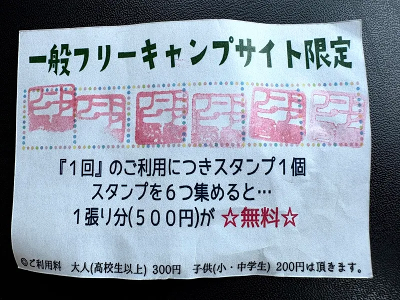 キャンプ場使用料は大人(高校生以上)で300円。子供(中学生以下)で200円。