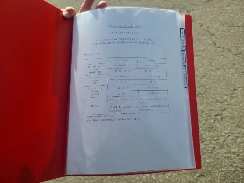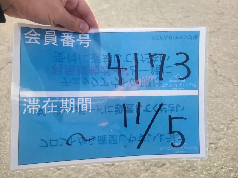 受付を終えると、キャンプ場利用案内書と番号が書かれたプラカードがもらえるので、車の見える位置においておきましょう。