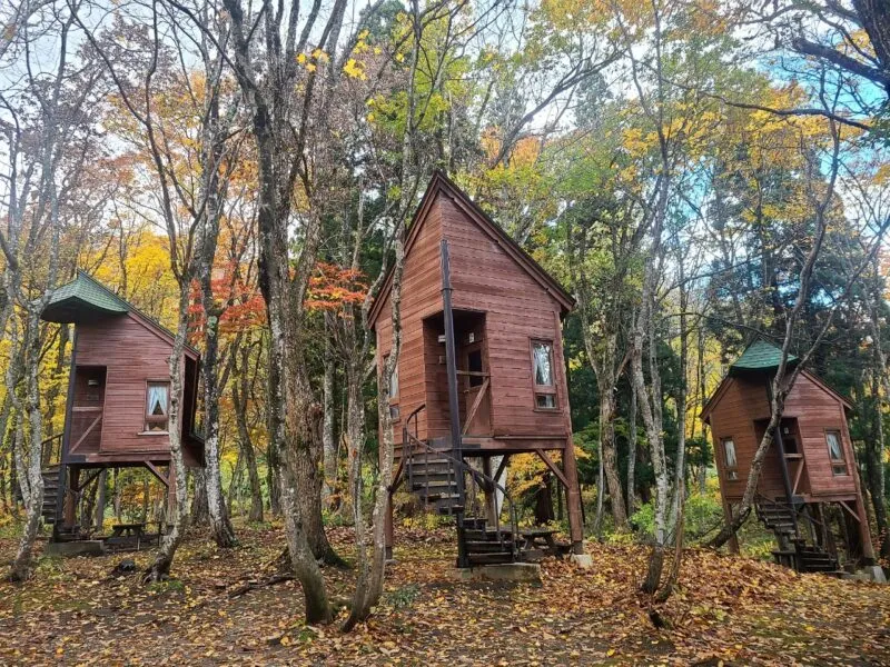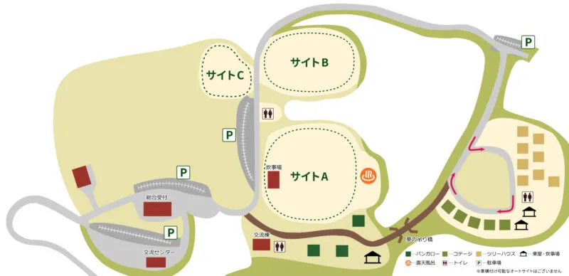 - トイレ、温泉、炊事場、売店、宿泊施設(バンガロー・コテージ・ツリーハウス)
