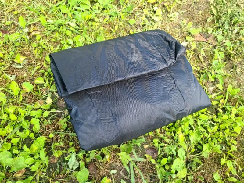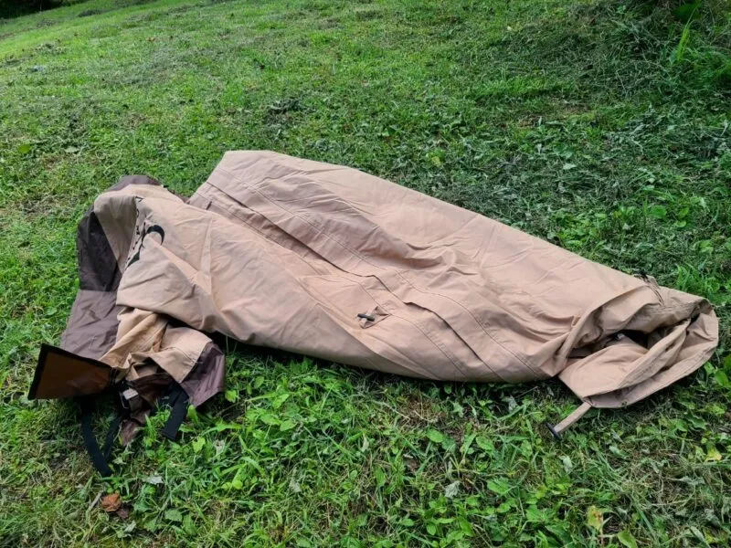テントをフルクローズしたときに荷物が外にほったらかしになり、夜露でびしょびしょ。